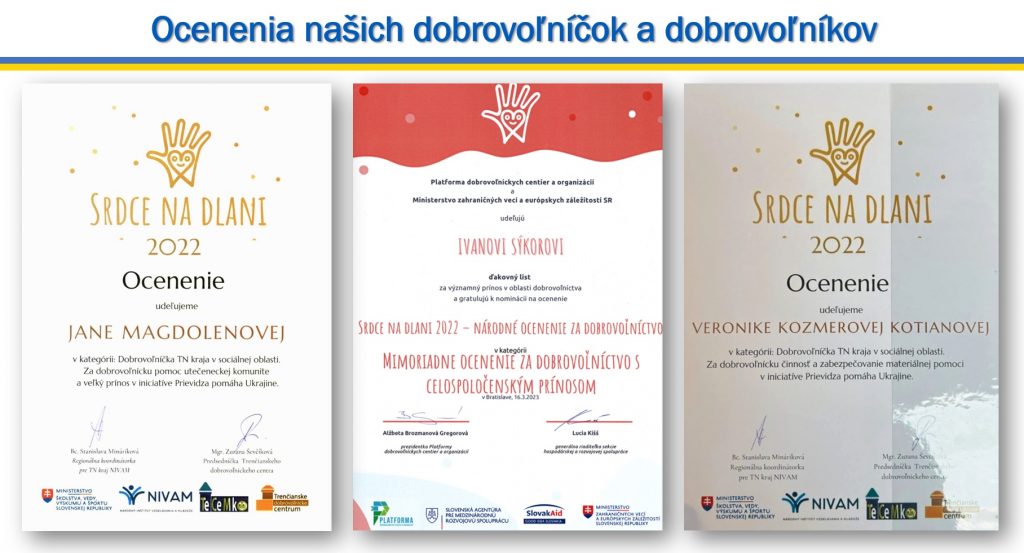 Od začiatku plnoformátovej vojny vo februári 2022 pomáhame ľuďom Ukrajiny v Prievidzi a okolí a najmä v Ukrajine – zvlášť zdravotníckym materiálom, ktorý zastavuje krvácanie. Pomohli sme desiatkami tisíc končatinových turniketov, niekoľkými tisíckami hemostatických gáz a izraelských tlakových obväzov, 235 generátormi / elektrocentrálami, doručili sme stovky lekárničiek a nosidiel pre ranených, viac ako 300 000 hodín tepla vďaka chemickým ohrievačom a tiež desiatky špeciálnych junkčných turniketov, viac ako 20 000 energetických tyčiniek, tablety na čistenie viac ako 40 000 litrov vody, stovky Balíčkov pomoci a viac ako 400 Krabičiek radosti. Prispeli sme tiež na výrobu maskovacích sietí či zákopových sviečok a tábor pre deti padlých ukrajinských vojakov. Zoznam pokračuje a táto pomoc bola možná vďaka tomu, že viac ako 3 800 darcov prispelo finančnými darmi vo výške viac ako 800 000 € a množstvom materiálnej pomoci.