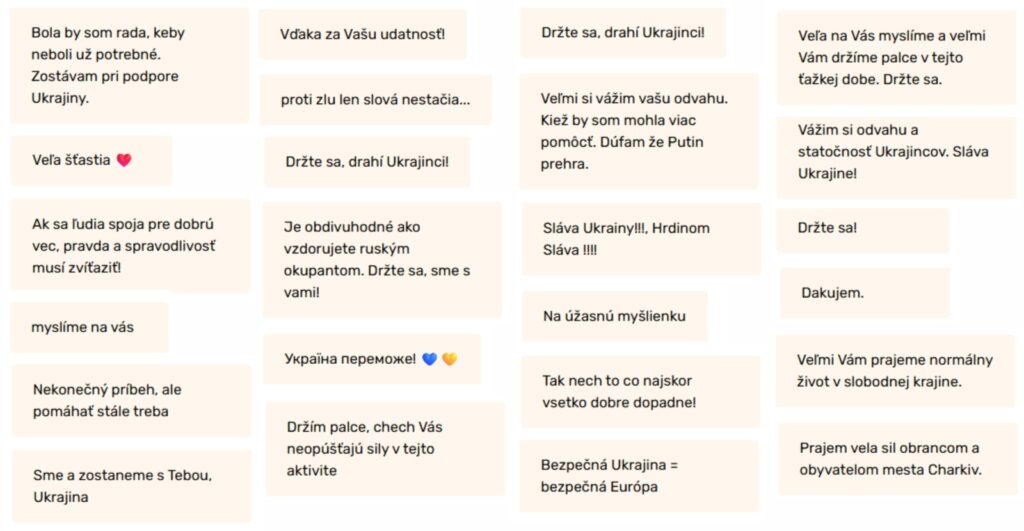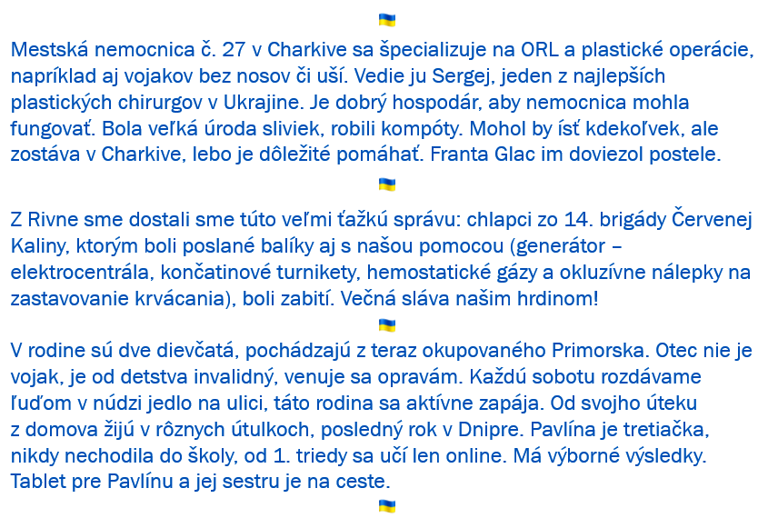 Takže, áno: statočný boj Ukrajiniek a Ukrajincov je bojom aj za našu slobodu. Bez pátosu: ľudia Ukrajiny, my ďakujeme vám a chceme vám pomôcť – je nás už viac ako 3 800 a mnohí z nás pomáhajú dlhodobo a pravidelne.